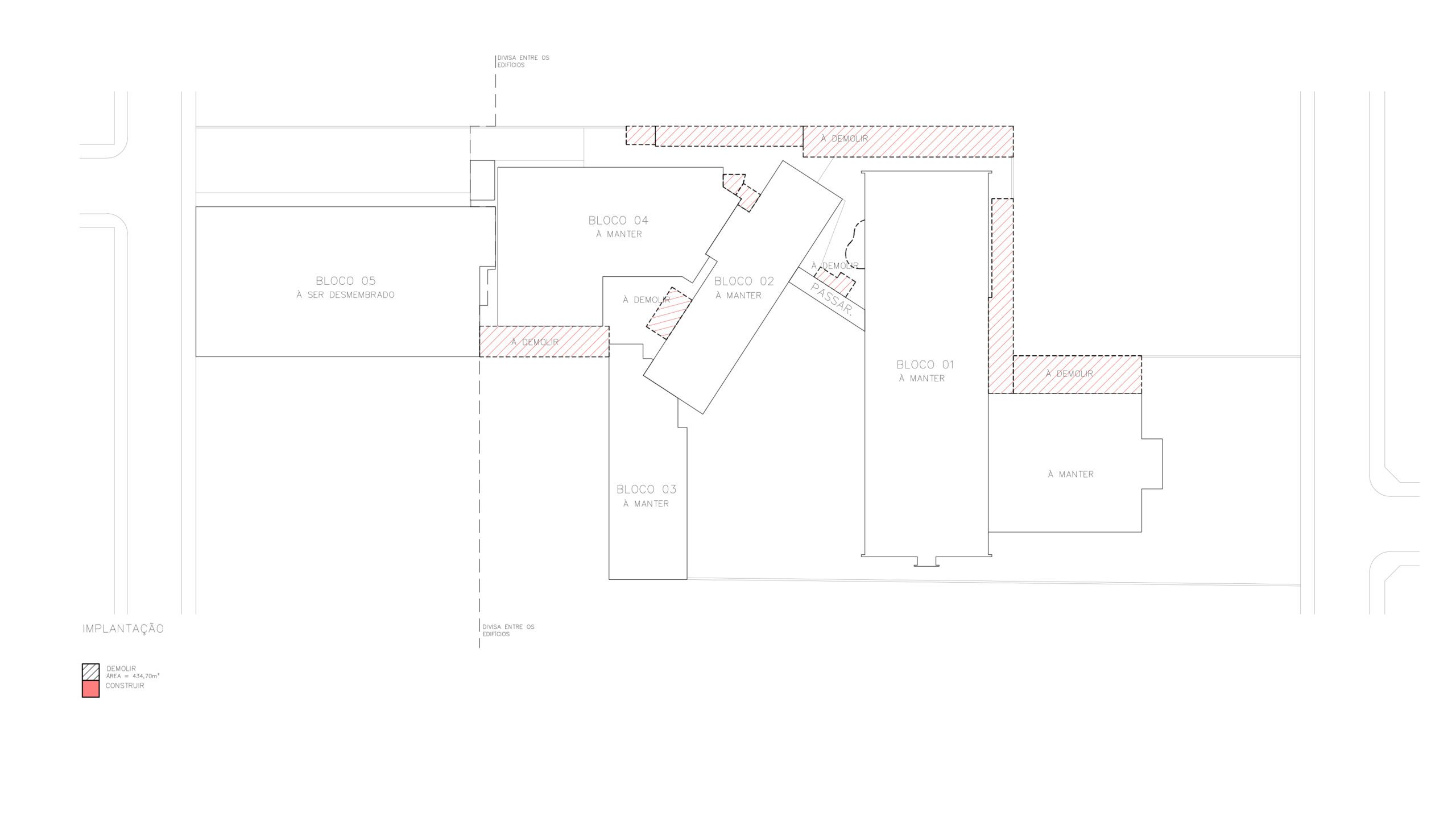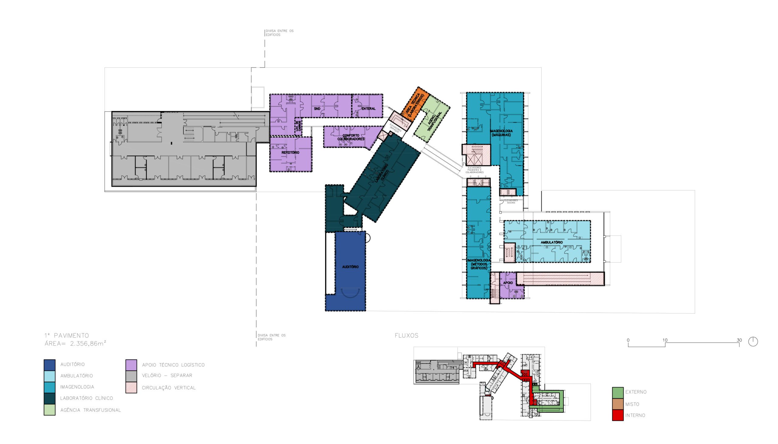 O bloco central e o volume frontal, correspondentes a primeira expansão, por terem sido originalmente construídos para serem um hospital, apresentavam melhores condições espaciais para a implantação dos serviços de saúde. Portanto, abrigaria o atendimento ambulatorial, as internações, parte do apoio ao diagnóstico e terapia e a administração. O bloco intermediário, localizado mais ao centro do lote e que corresponde ao primeiro edifício construído, por ter menor capacidade de alteração de seus espaços físicos, abrigaria a outra parte do apoio ao diagnóstico e terapia, além das atividades de ensino e pesquisa. O bloco posterior, por ter acesso independente pela Rua Rio Grande do Sul (posterior ao acesso principal), abrigaria os apoios técnicos e logísticos.