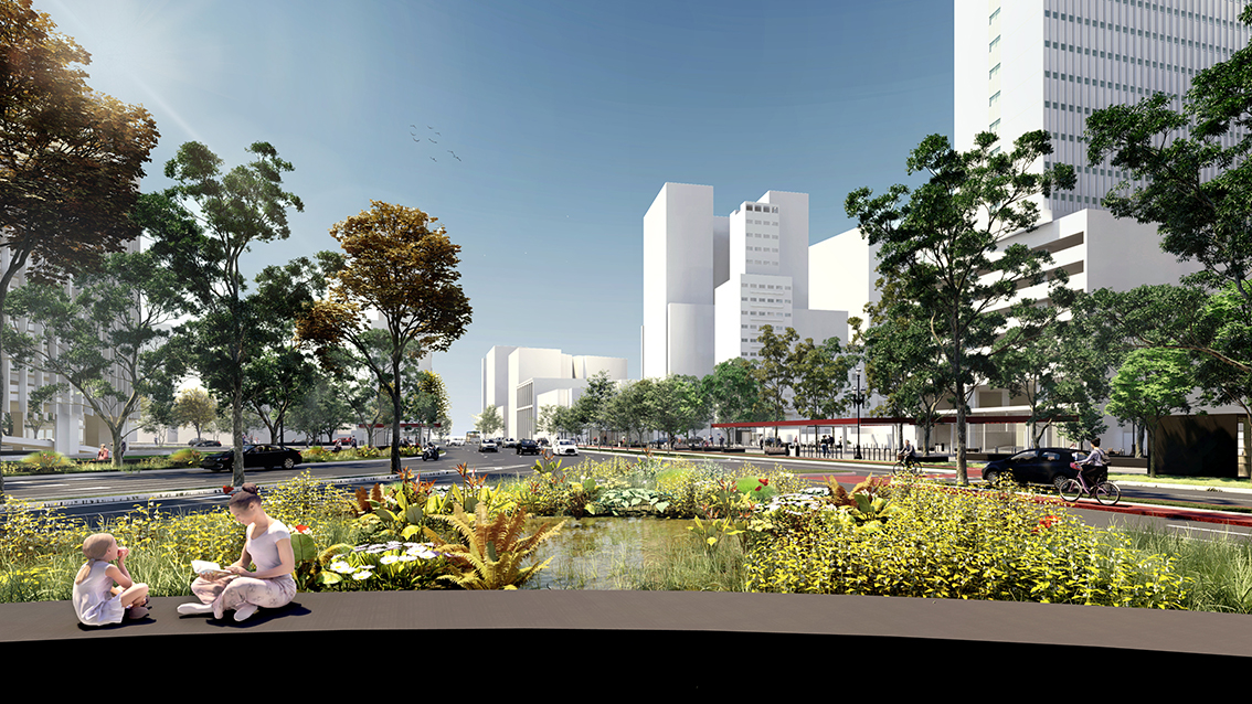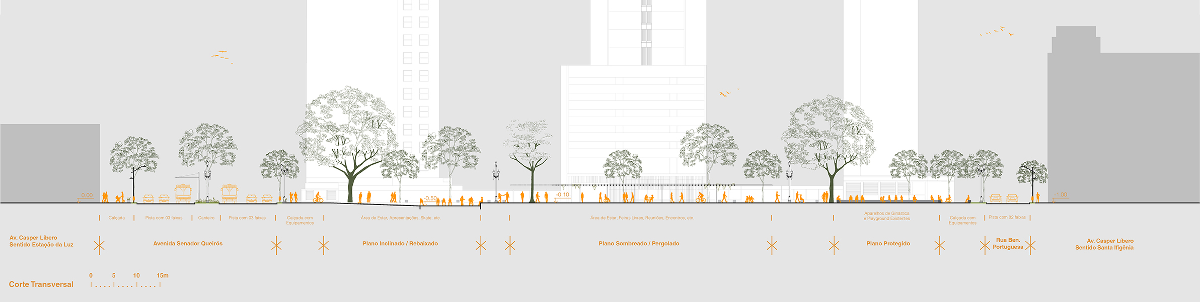 A arquitetura da paisagem é elementar para estabelecer a ideia de lugar e configurar uma identidade única ao espaço público. Propusemos uma série de escalas de aproximação do usuário com a paisagem, promovendo uma relação ativa com esses espaços.