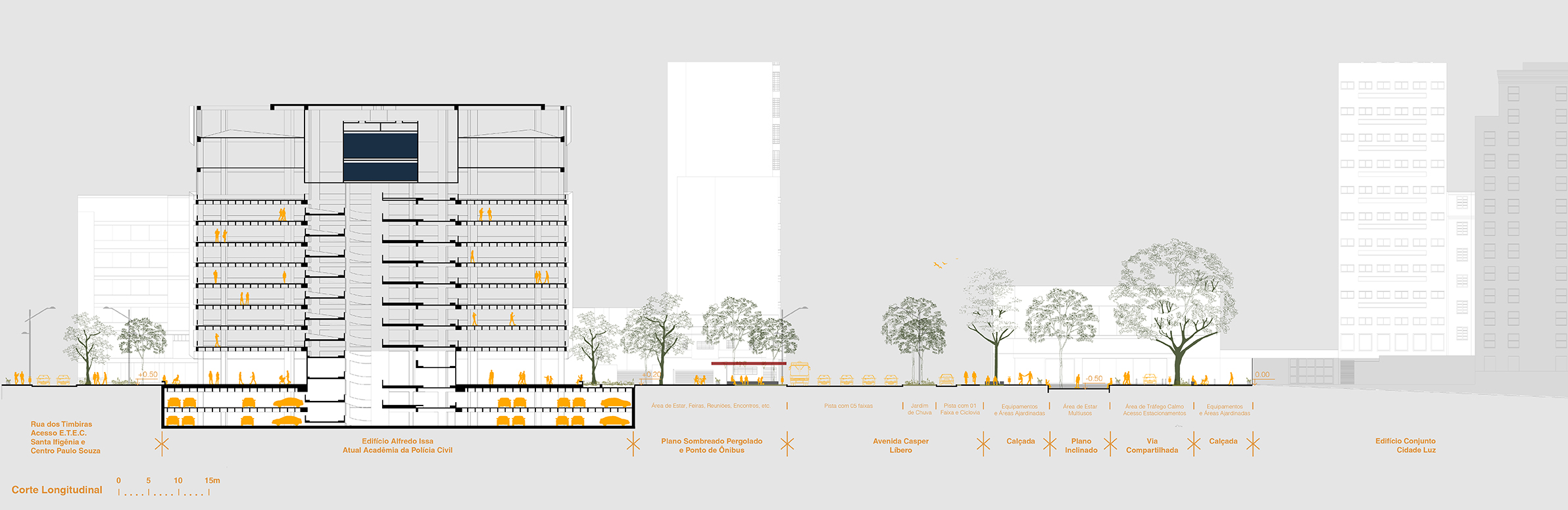 Dessa maneira, considerou-se essencial manter e ampliar a prioridade das faixas exclusivas de ônibus das Avenidas Senador Queirós, Casper Líbero e Ipiranga, integrando-as a um novo ponto de ônibus junto a Praça Alfredo Issa, a fim de atender, principalmente, o intenso fluxo de usuários da E.T.E.C. Santa Ifigênia e Centro Paula Souza.
