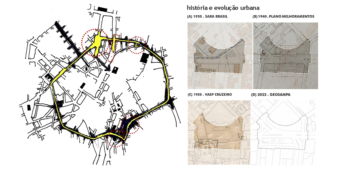 Sara Brasil (1930) o perímetro de intervenção serve como articulador dos fluxos de bondes, vindos da Estação Júlio Prestes e do fluxo direto vindo da Estação da Luz.