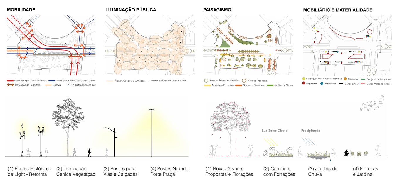 A proposta busca estabelecer uma cobertura luminosa adequada e distribuída ao longo de toda área de intervenção, através de distintos tipos de iluminação, em alturas adequadas para pedestres, ciclistas e veículos, evitando áreas sombreadas, penumbras e conflitos com as árvores.