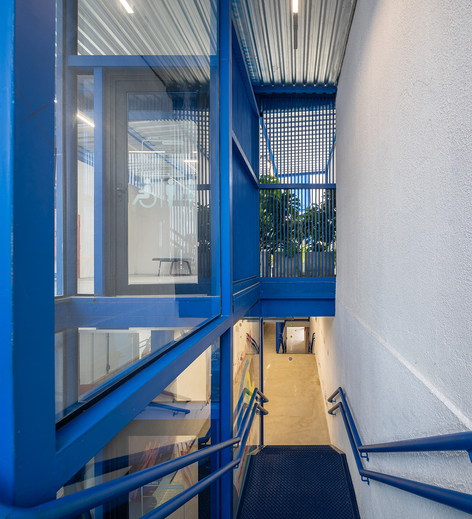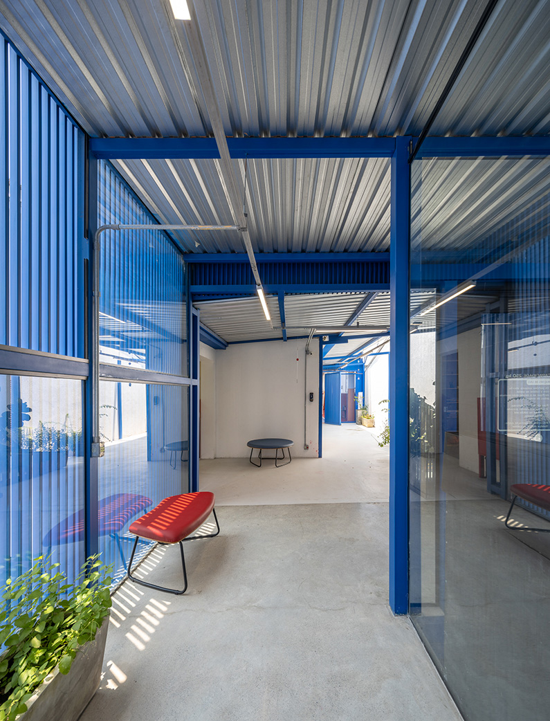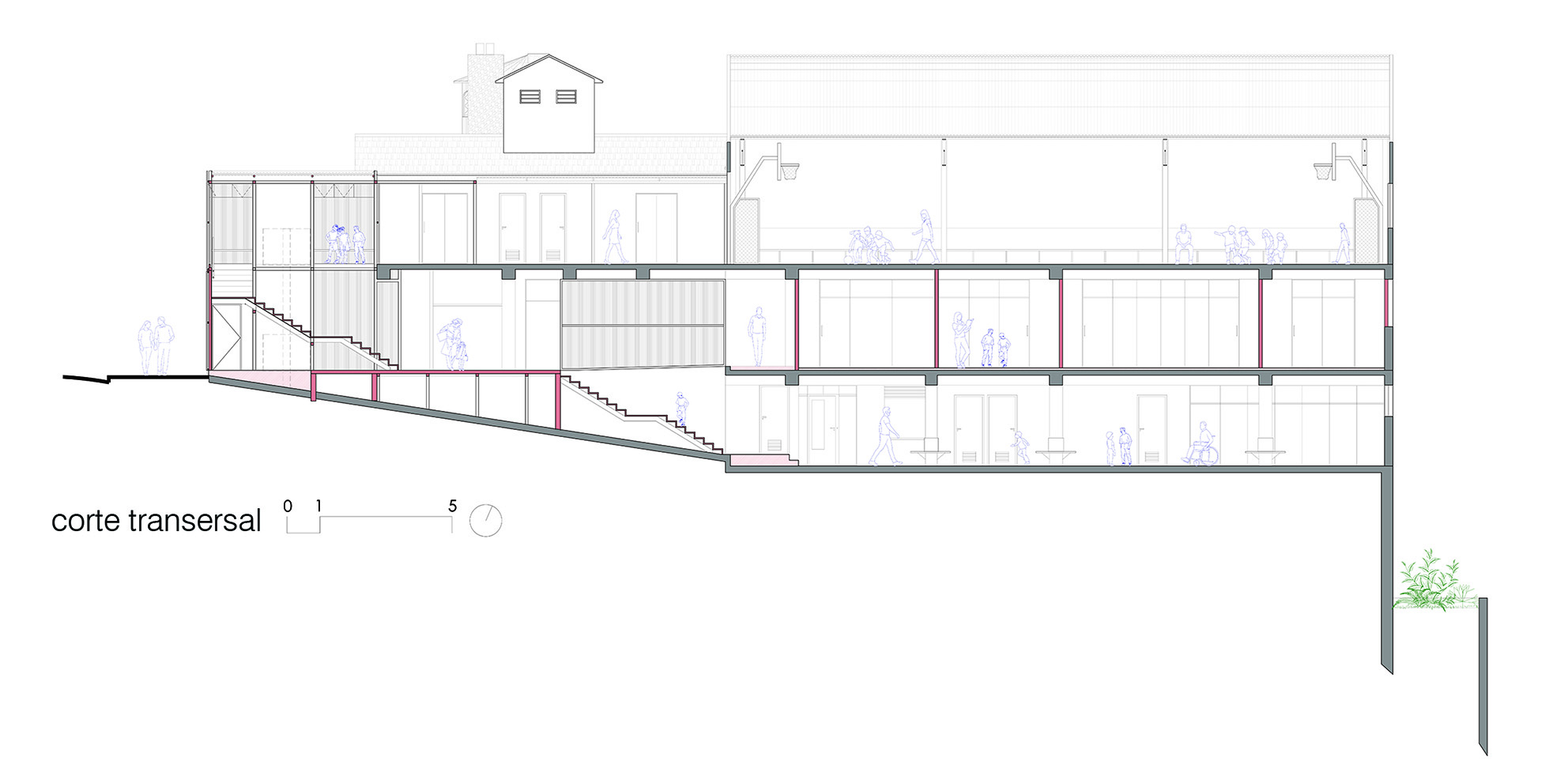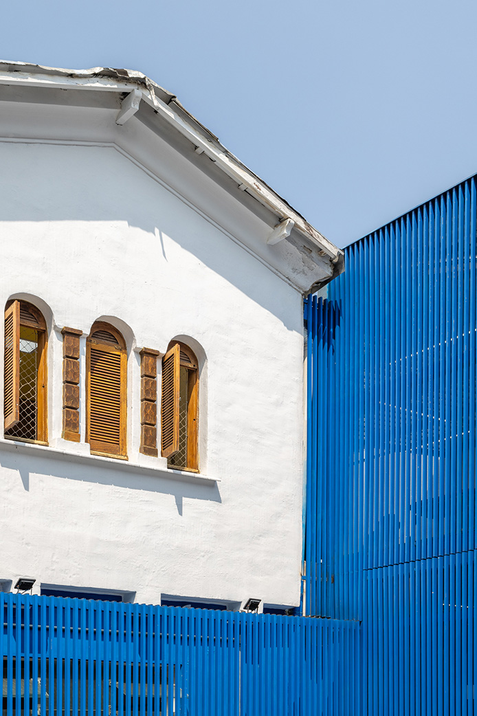 A materialidade escolhida, estrutura e fechamentos compostos por tubos metálicos de diferentes tamanhos, teve como princípio criar volumes homogêneos que contrastassem com as partes originais restauradas, criando um diálogo entre o passado e o presente.