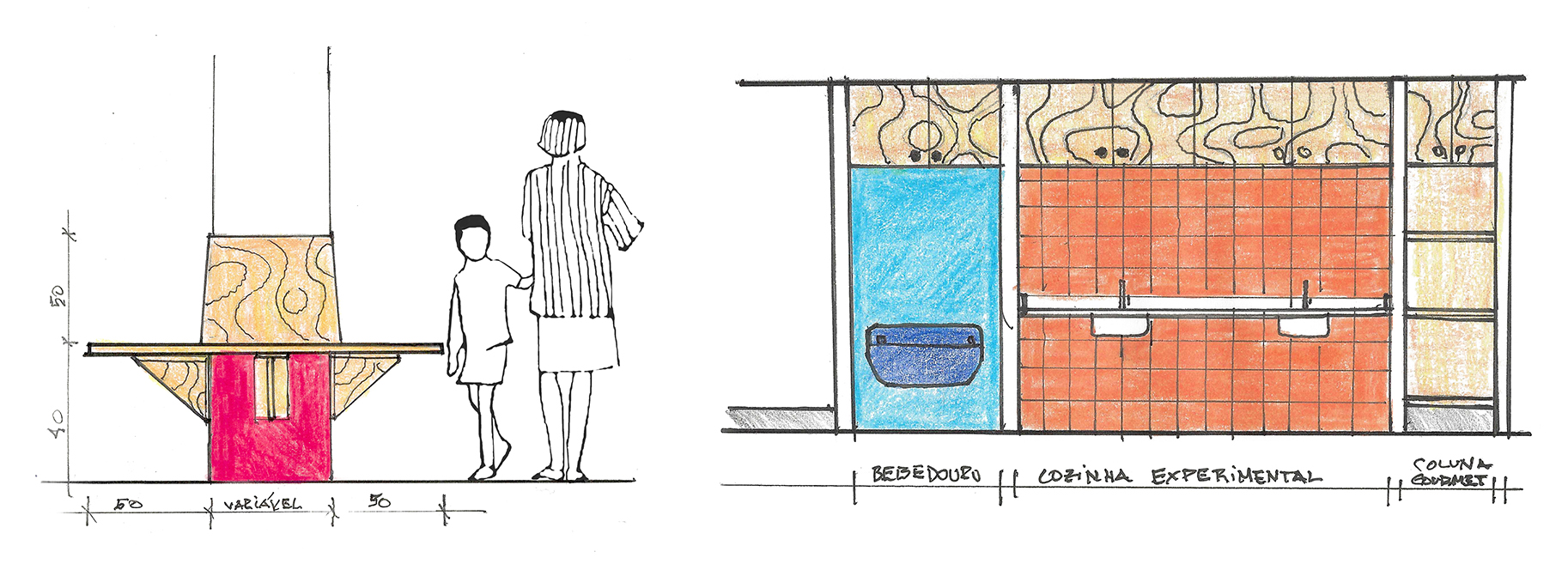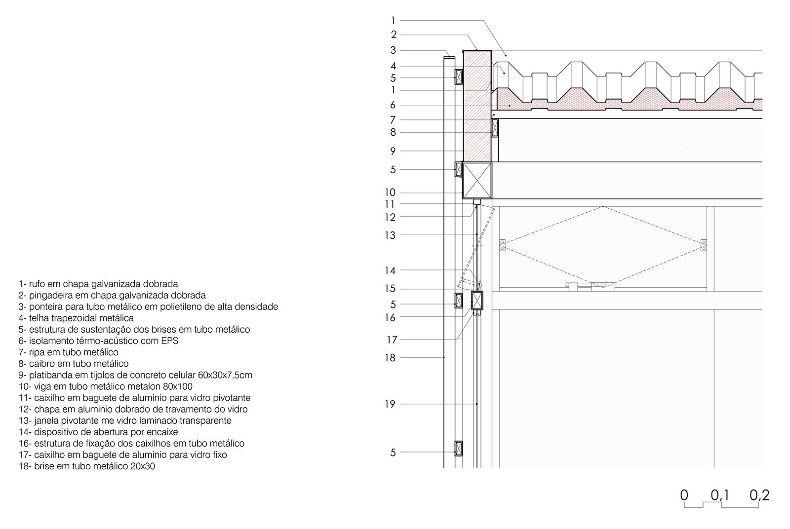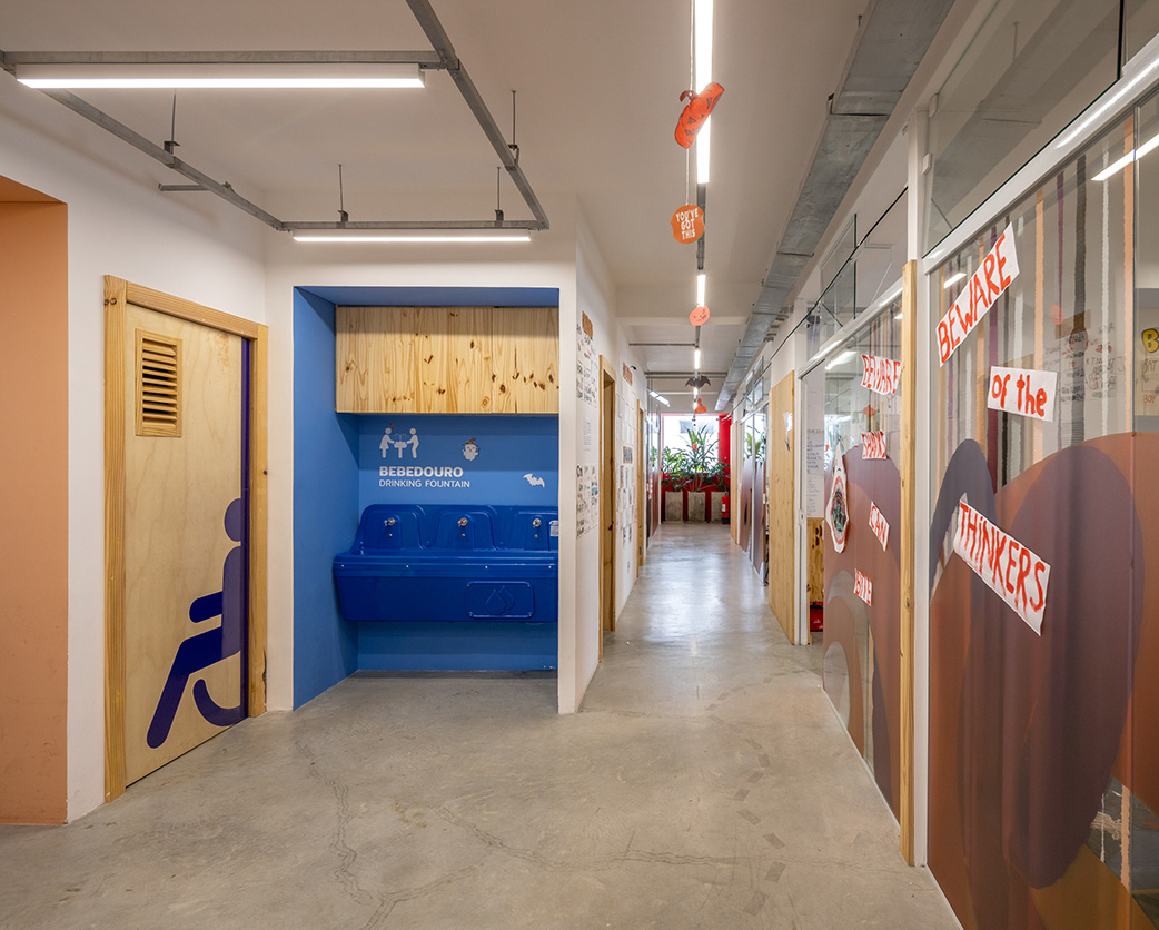 A materialidade escolhida, estrutura e fechamentos compostos por tubos metálicos de diferentes tamanhos, teve como princípio criar volumes homogêneos que contrastassem com as partes originais restauradas, criando um diálogo entre o passado e o presente.