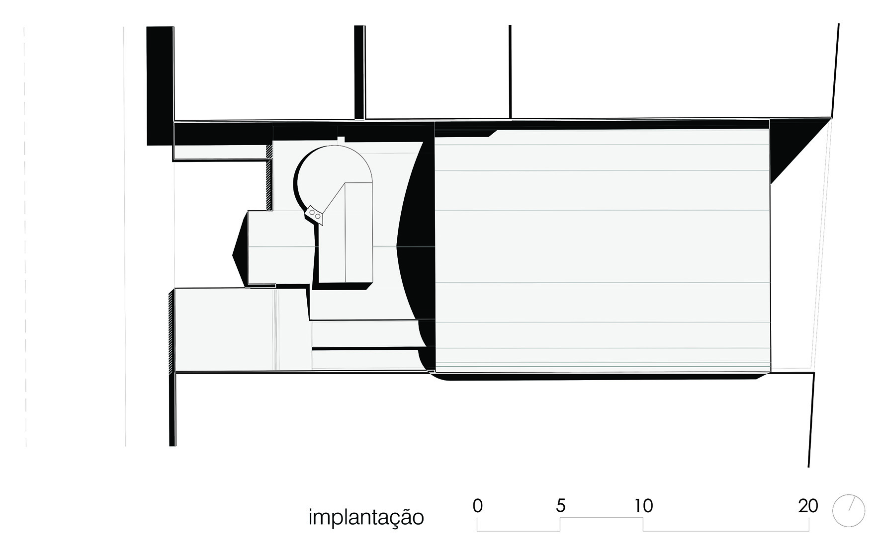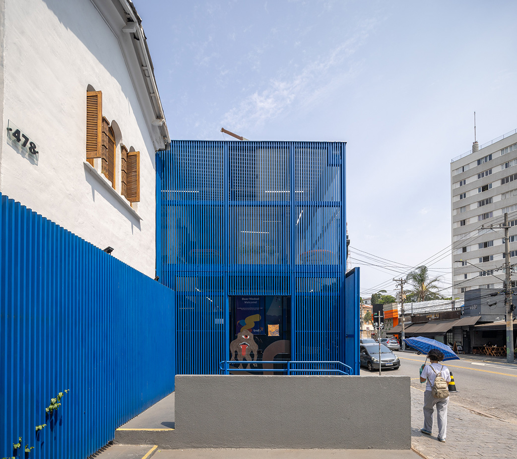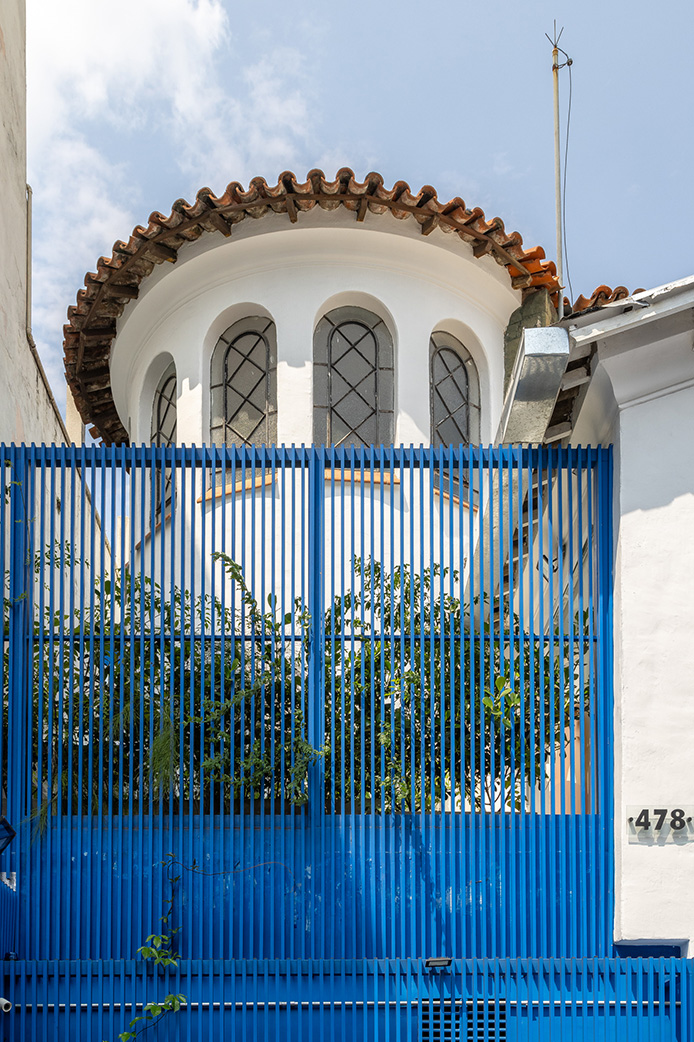 Durante o dia, os portões, ao serem abertos, se incorporam aos volumes e elementos da fachada, fazendo com que sejam imperceptíveis. Durante a noite, os portões se fecham, mantendo a permeabilidade visual para os vestígios do belo palacete da década de 1940.