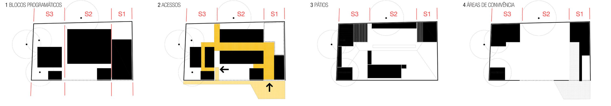 O partido proposto se organiza através do desenho dos vazios. Esses vazios foram projetados para serem pátios, escavados estrategicamente. Além de oferecerem luz, ventilação natural e contato com o meio externo, se tornam também áreas dinâmicas, que valorizam e diversificam os distintos usos possíveis que a comunidade venha a idealizar. Apostamos na autonomia desses espaços, pois ao darmos a possibilidade do uso independente podem vir a ser agenciados pelas lideranças da comunidade aos finais de semana e feriados, ou mesmo às noites, enquanto a UBS não estiver em funcionamento.